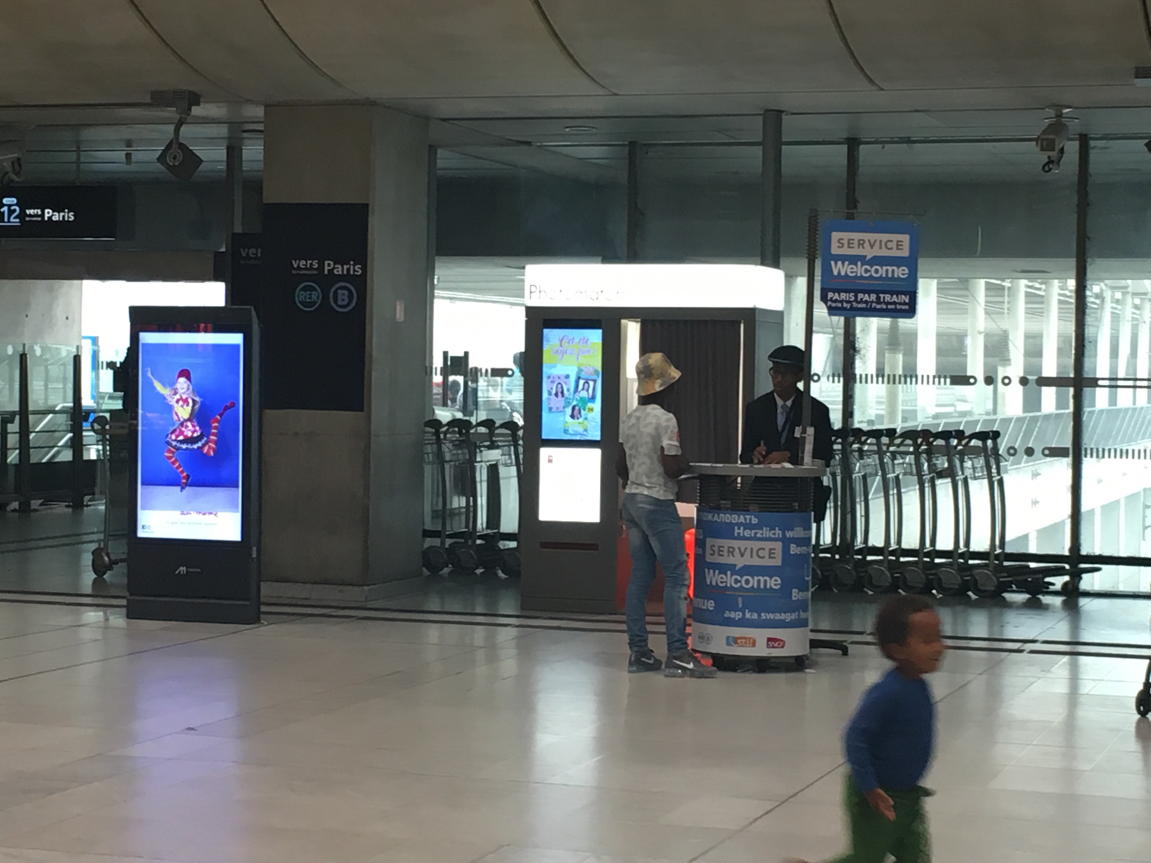 我降落在DCG T1航站楼,出关后沿着指示乘坐小火车转去T2航站楼,中间经过T3和两个parking(就是这么奇葩),出来下了扶梯就是火车站了,人很多在等待的地方就是了。如果不确定自己走的对不对谨记分分钟寻找工作人员问,这个台子可以算作问询处,大厅里南北门分别有一个,穿蓝色衣服的工作人员都很Nice,我甚至不放心把我的车次给他看是不是等在这里.说到这里要讲一下他们的车次是在发车前十几或者二十几分钟才知道哪个门站台哪个站台,大厅里有蓝色大屏幕,看大屏幕上的班次,时间到了班次后面会显示站台数字,然后自己去相应的站台,那里有人检票。就是下面这样上的蓝色屏幕。根据我的观察有两种,一种是TGV的车一种是普通的Train,别看错了。提前一个小时车次信息就会在屏幕上了。