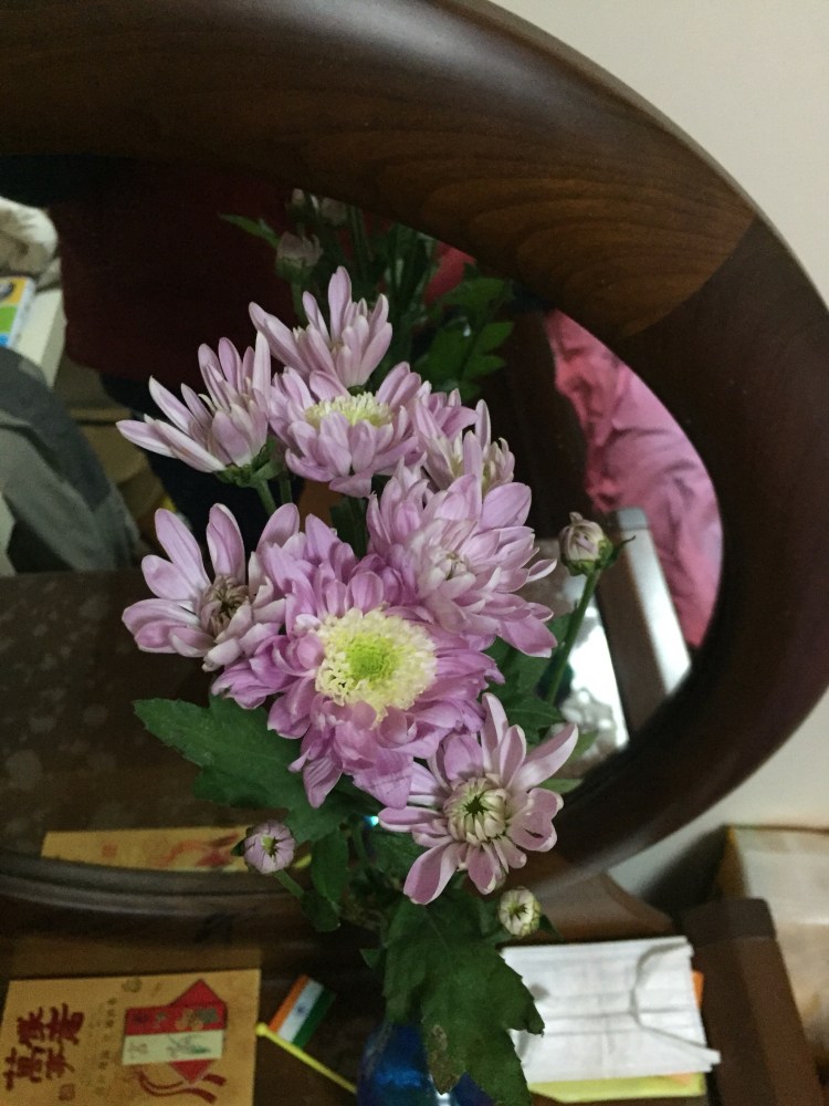 上完课回家,我们一起去了趟菜场,买了富贵鱼和鱼头,还买了花。兮兮挑了粉色的雏菊和满天星,我则挑了白色百合。