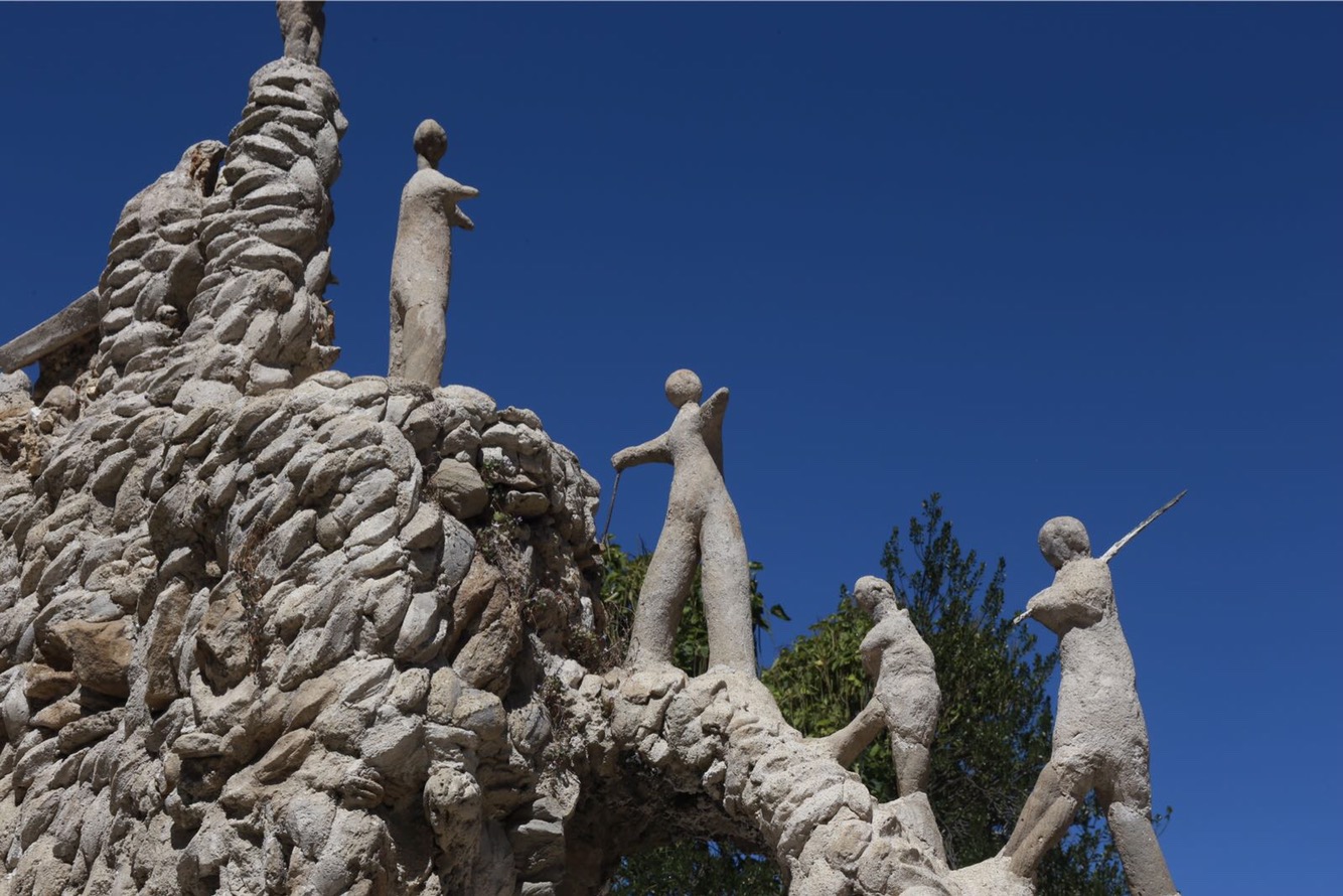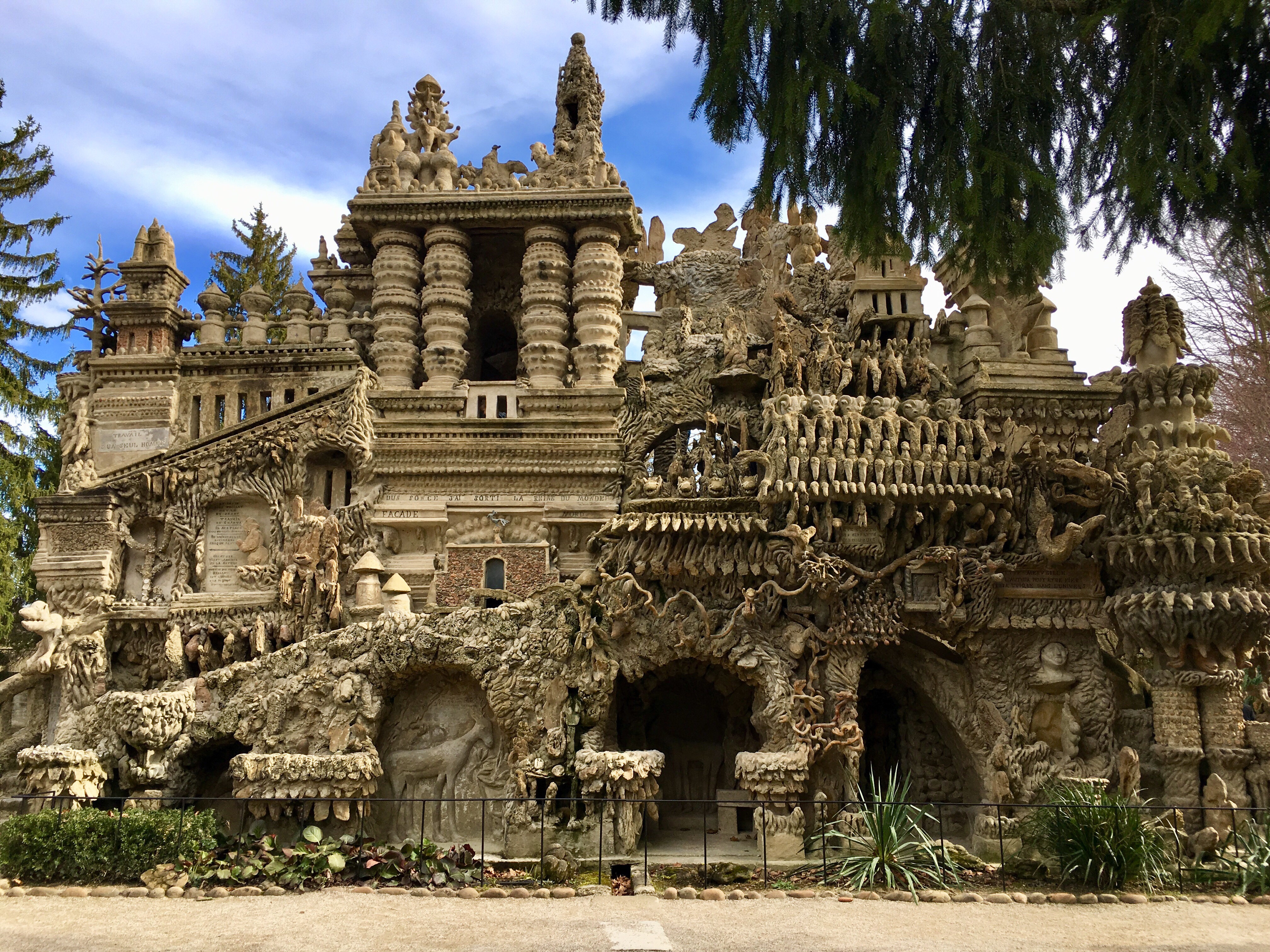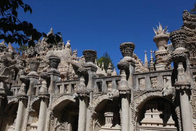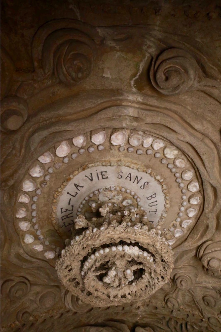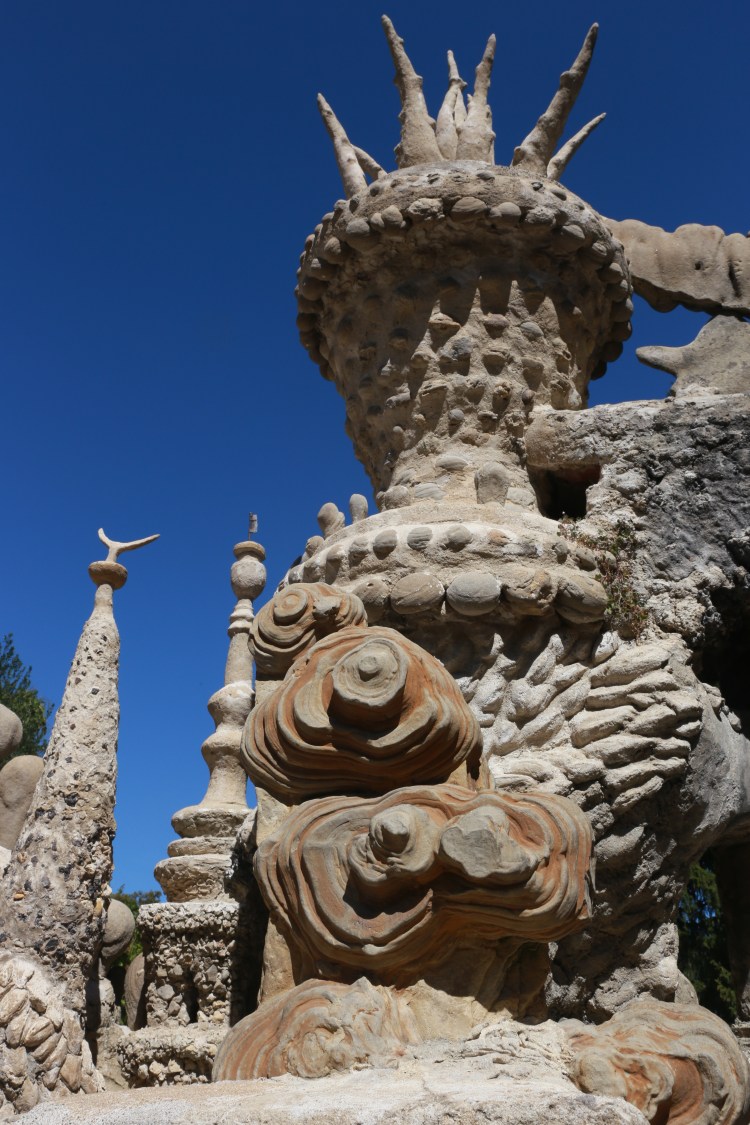 眼前俨然是一个奇艺的石头城堡!!!可能是毫无心理准备,整整5分钟我在原地呆呆望着眼前用各种石头泥土塑造的充满想象力的造型,不知道如何形容我的感受。我很难不把它和梵高的建筑联系起来,然而这更亲和,更自由,俨然就是把奇幻梦境搬到了现实家里的花园。然而更难以置信的是,这份工程,坚持了整整33年,在邻居最初的不理解嘲笑到后面的崇敬,他靠着自己一个人。这是一个人普通人在毫无专业建筑知识的情况下,仅仅凭着自己的想象和平日送报刊接触到的画册中吸取灵感,用自己的双手日积月累搭建起来的。他在这里雕刻对人生的思考,喜爱的诗词,想象的飞禽走兽,世界各地的建筑,用贝壳点缀城堡内部,雕塑成水晶灯的造型。